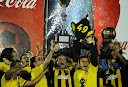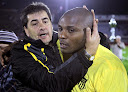 Footballer Antonio Pacheco (L), of Uruguayan team Penarol, celebrates with teammate Fabian Estoyanoff, after scoring against Defensor in the final of the Uruguayan football tournamant, at the Centenario stadium in Montevideo on June 4, 2013. AFP PHOTO / Miguel ROJO